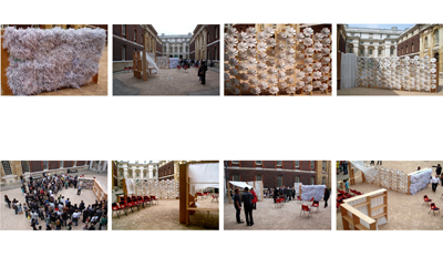 installation type+location: a series of screens support surfaces which are agitated by the wind: shredded paper, windmills, silk curtains