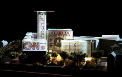 invisible elements: sited on the river, where barges transport coal and industrial cargo, the programme aimed to deploy more state of the art technologies for active video screen façade systems such as liquid crystal screens and LED interfaces. moving on from the heavy industry of the ruhr valley into the emerging digital industry, the building design is an expression of the rapidly developing computer technologies of the time. this project explored the accelerating speed of information transfer and communication at the dawn of the digital age.